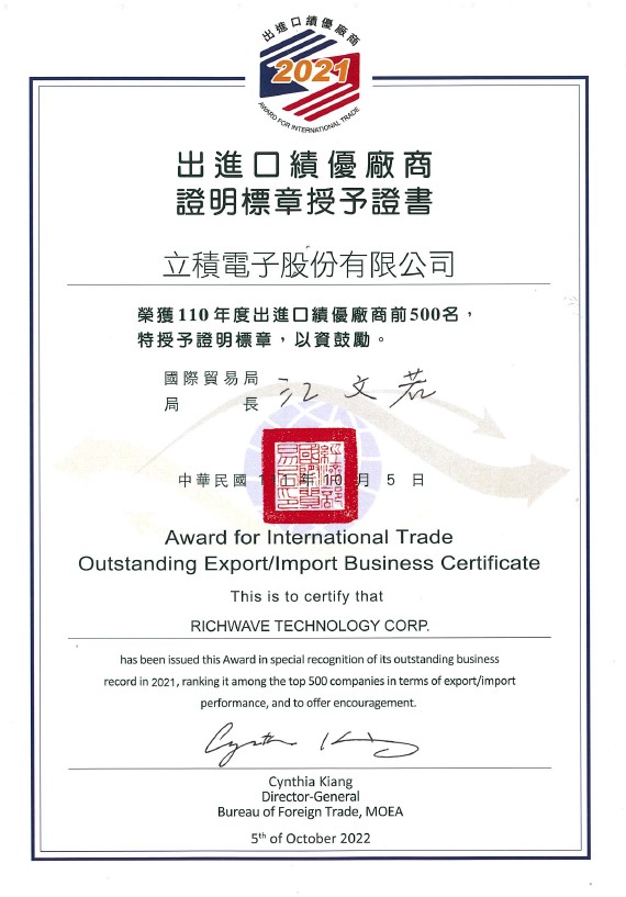 荣获经济部国际贸易局110年度「出进口绩优厂商证明标章证书」
