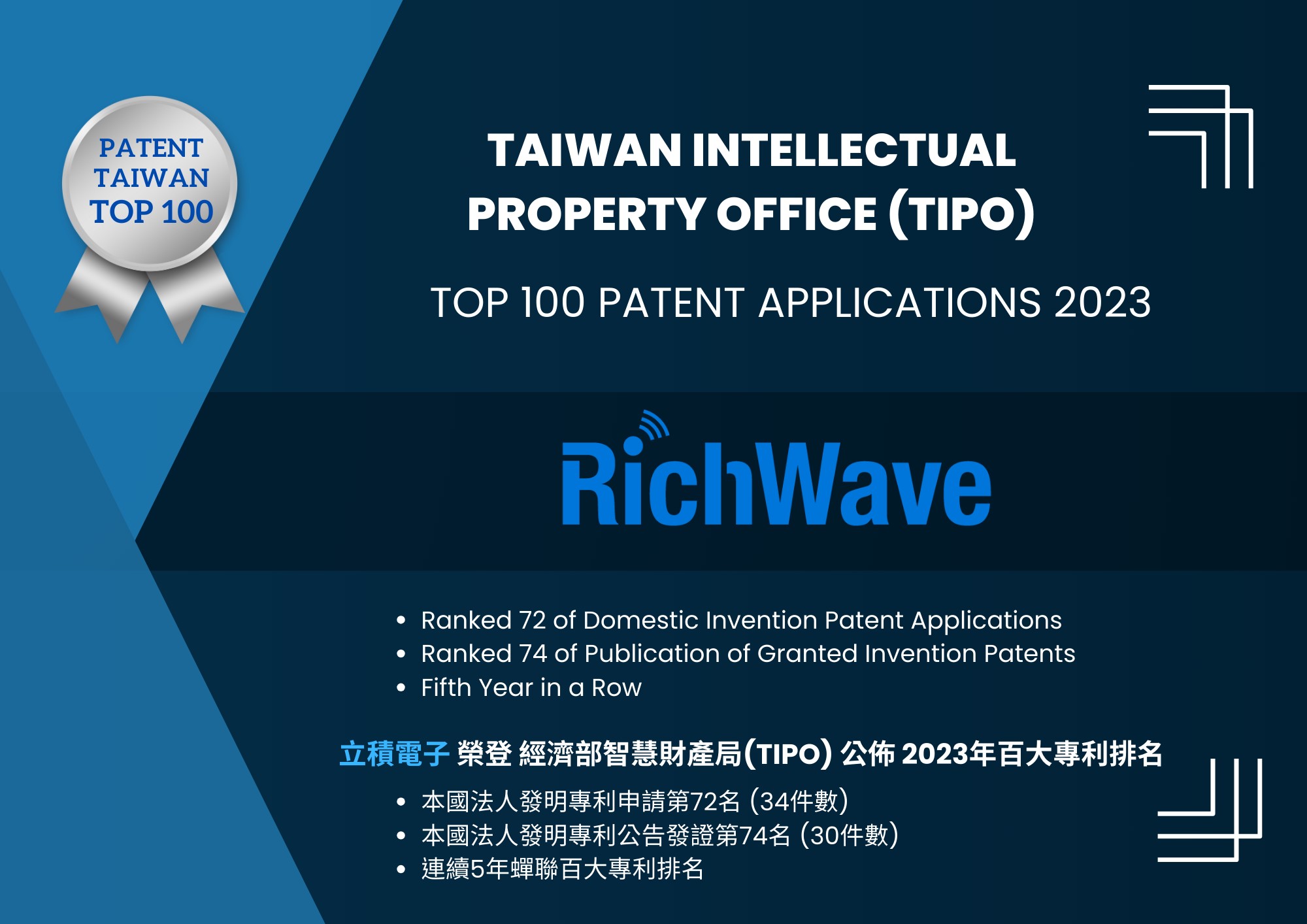 荣登 2023 TIPO 发明专利申请及获证(连续5年) 百大排名