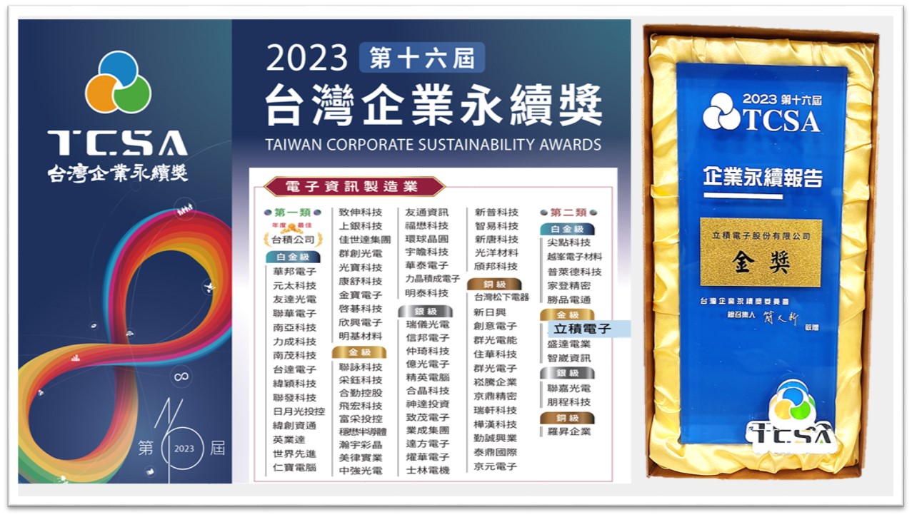 立積電子獲頒2023台灣企業永續獎 (TCSA) 電子資訊製造業「最佳永續報告」第二類企業金獎